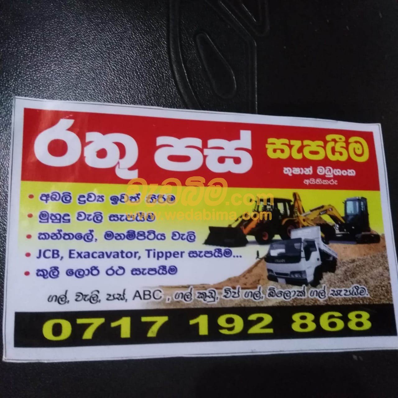 ශ්රී ලංකාවේ බර යන්ත්රෝපකරණ සඳහා තුෂාන් සැපයුම්කරු සහ ප්රවාහන සැපයුම්කරු. ශ්රී ලංකාවේ Jcb, කැණීම් යන්ත්ර සහ ටිපර් කුලියට දීමට ඇත. Jcb සහ කැණීම් යන්ත්ර පැයකට කුලියට දීමට සහ හොඳම පැයක ගාස්තු ලබා ගන්න. ව්යාපෘති සඳහා හෝ තනි කුලියට ගැනීම සඳහා ටිපර් ලබා ගත හැකිය. පැයකට පිරිවැය සහ කොළඹ, කළුතර, නුගේගොඩ සහ කඩවත අවට සේවාව සඳහා පමණි. අපි නුගේගොඩ හොඳම තරඟකාරී මිලකට ගංගා වැලි, සෝදාගත් වැලි, ලෝහ, ගල්වල දූවිලි, abc ලෝහ, සිමෙන්ති බ්ලොක් සහ රතු පස් සපයන්නෙමු.....